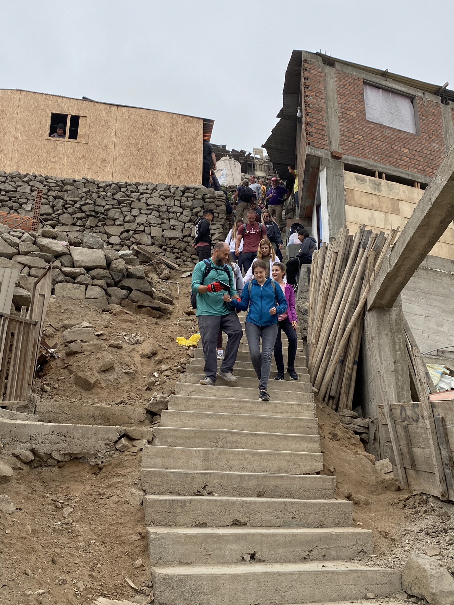 When we arrived at her community, Juan Pablo, it took a few seconds to realize that this was not like any of our previous builds!! The steps became less like steps and more like partly piled layers of unsteady rock as they rose higher and higher. The people in this area didn’t know who we were because Reimagine never built there before. They didn’t come out to assist us and there weren’t enough of us to stand and pass up the supplies. The location of the slab was up and to the right of the purple structure that is next to the yellow house at the top of this horrifying stairway. This was going to be a treacherous one!